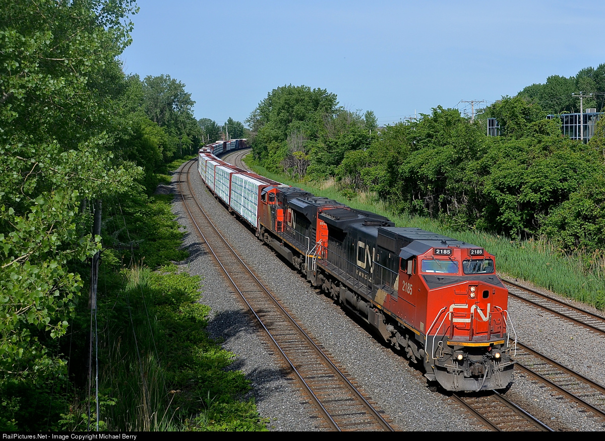 Heading for Vermont. CN X324 has CN 2185 & CN 8843 has 236 axles as it heads east just out of Taschereau Yard. He will pick up some cars at Southwark Yard and then head to St. Albans, VT for interchange with the New England Central Railroad.