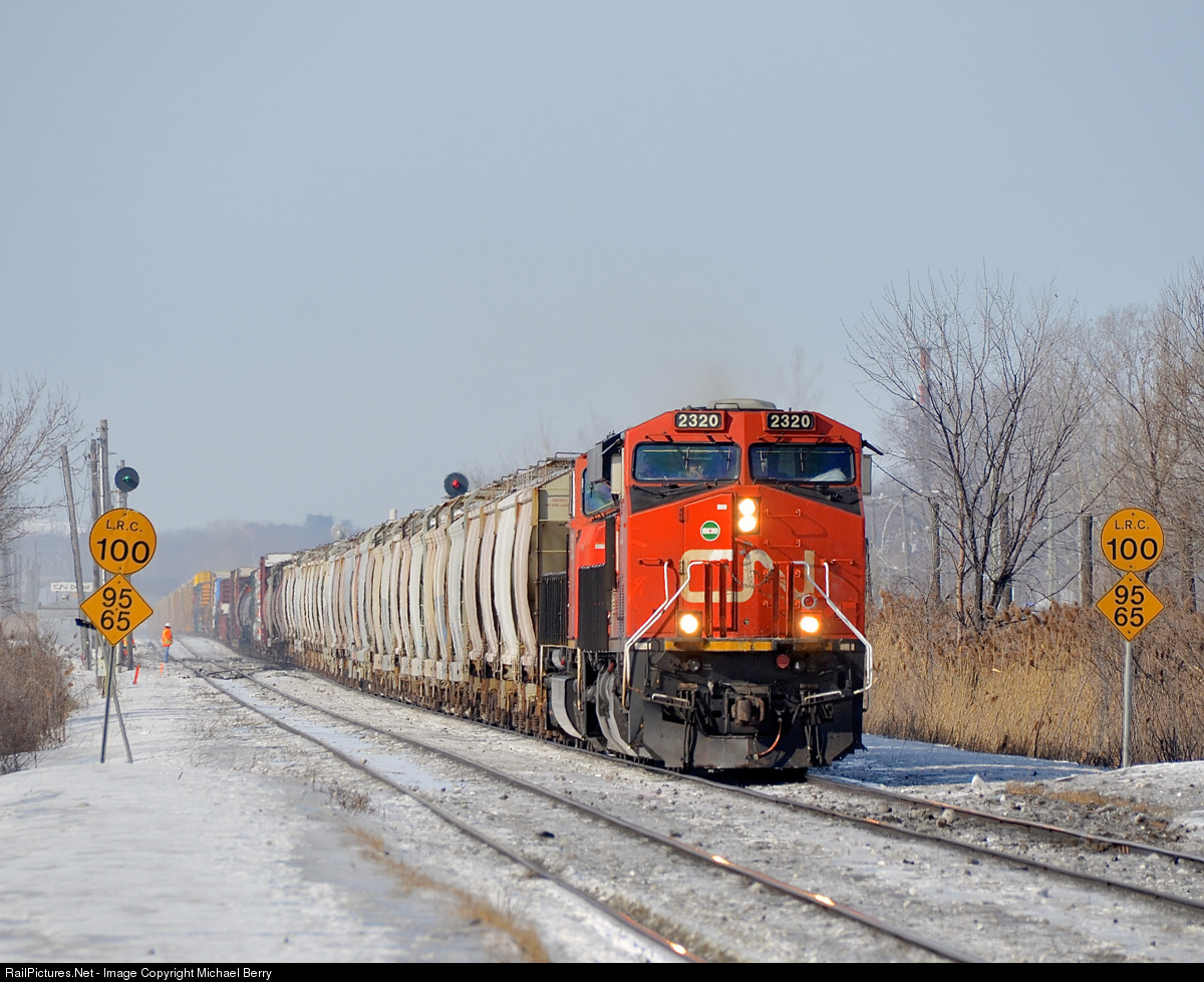 | CN 372 passing speed limit signs at Dorval. A later than usual CN 372 passes through Dorval with CN 2320 and CN 5689 at the head end and CN 8935 as the DPU during a brief sunny spell. The green signal at left is for VIA 63. |