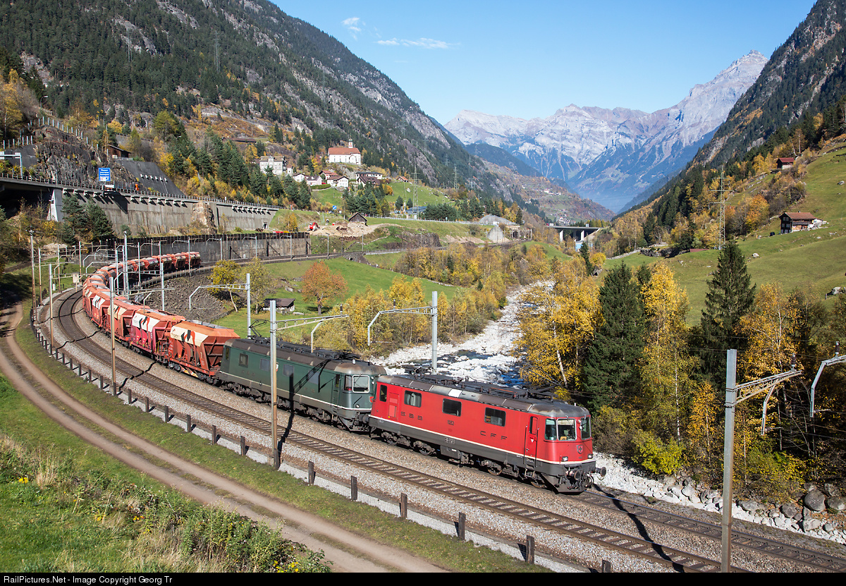 | Gravel train from Hüntwangen to Bodio with Re 4/4 II # 11252 and one of only two green Re 6/6 # 11646 "Bussigny" in the Wattinger curve near Wassen. |