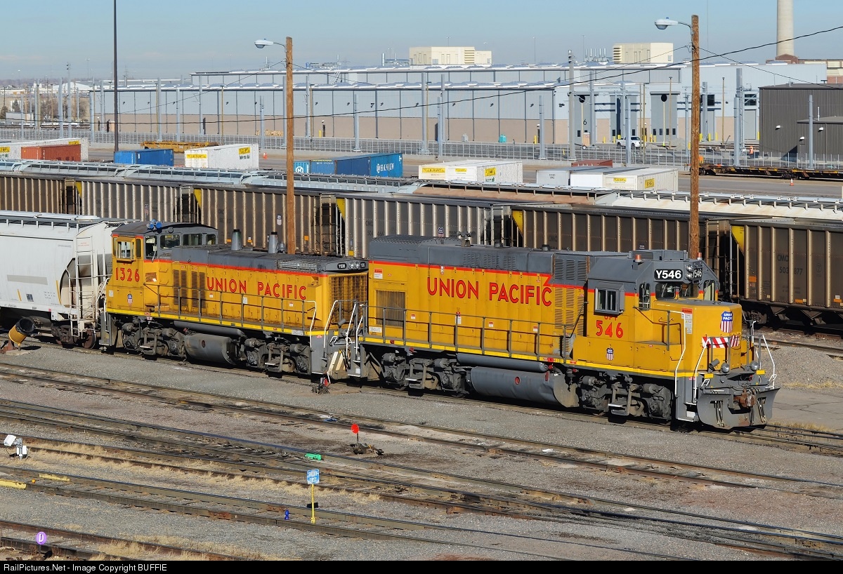 | Here we see a unique pair of engines working the North Yard. UPY 546 (GP15-1) and UPY 1326 (MP15DC) were both originally built one year apart for the Chicago & Northwestern. 1326 was built in 1975 and 546 was built in 1976. Notice they both still retain their original cold weather windows. |