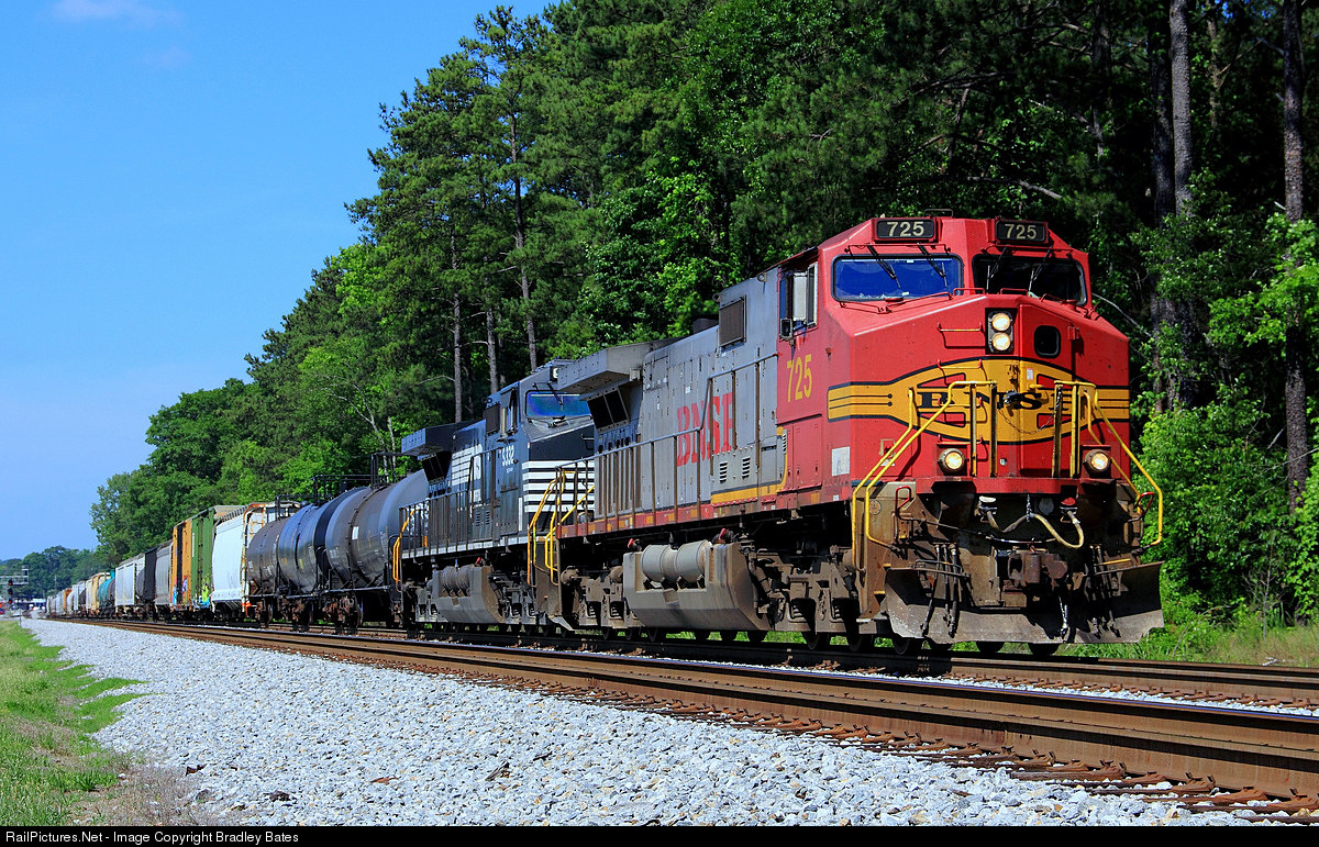 | Norfolk Southern Freight 172 East through Irondale, AL. getting ready to tie their train down at Norris Junction with BNSF C44-9W #725 in the Warbonnet paint scheme on the point |