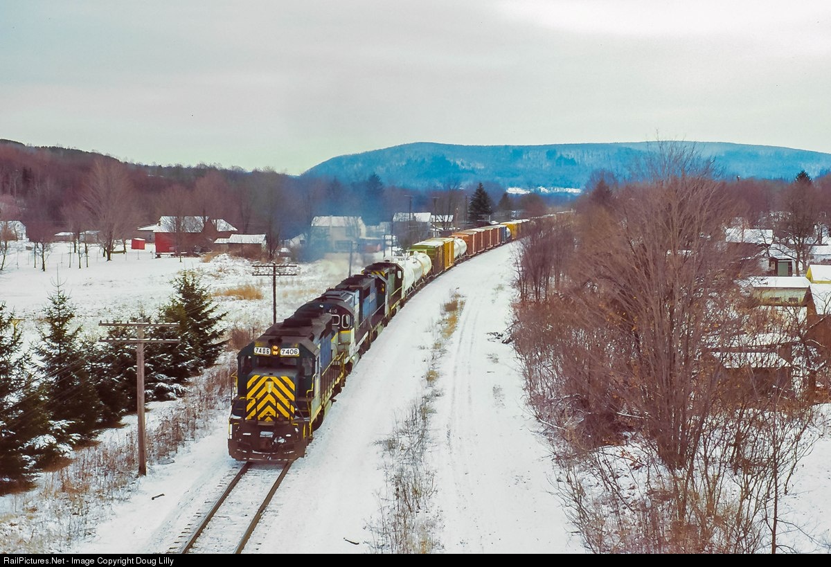 | A Delaware & Hudson Penn Division detour train rolls eastbound on the Conrail Southern Tier Line near Kirkwood, New York. |
