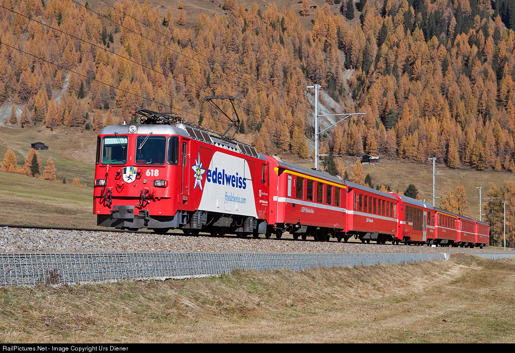 | Ge 4/4 II 618, painted in the publicity paint scheme for the charter airline Edelweiss Air, is pulling the RE 1029 from Landquart to Davos Platz. |