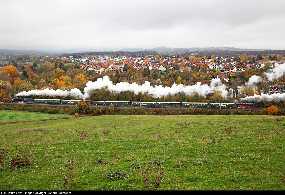 Two pacific steam locomotives at one train: 01 150 (former Deutsche Bundesbahn) is pulling cars of "Swiss Classic Train" from Singen (Hohentwiel) to Rosenheim. 01 519 (former Deutsche Reichsbahn) is at the end for pushing the train in a following grade called „Hattinger“.