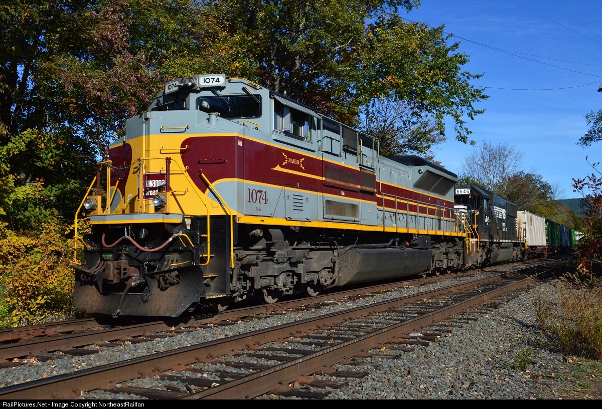 | NS's Lackawanna Railroad heritage unit leads a 287/23K combo, and sits crewless at Shelburne Falls, MA. |