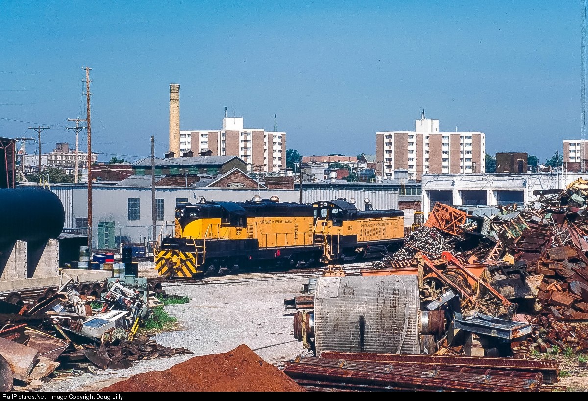 The Ma and Pa (Maryland and Pennsylvania) was a steam-era fan favorite that connected the 45-mile-distant cities of York, Pennsylvania and Baltimore, Maryland, by way of 72 miles of trackage through mostly rural farmland. In 1958, Pa left Ma when the road abandoned almost its entire route in Maryland. By the time this photo was taken in 1986, the Ma and Pa had retrenched to be a local switching road around York. Here an ex-Reading GP7 and an SW9 sit outside the fenced-in, junkyard environment enginehouse.