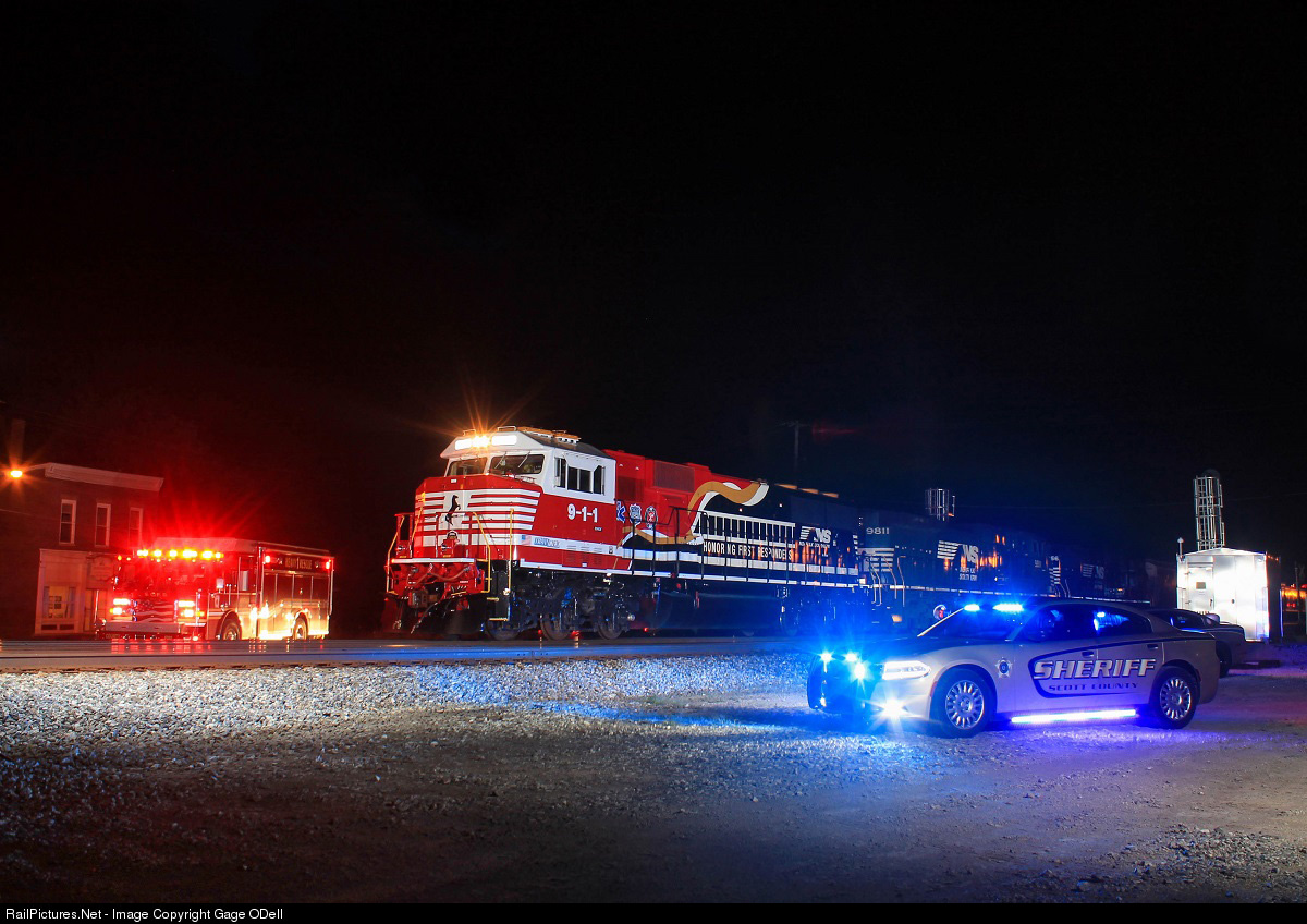 NS 48D, with the Honoring Our First Responders unit leading, pulls to a stop in Georgetown, KY for a quick photo shoot with Georgetown's finest! With the help of the NS Photographer, Casey Thomason, Georgetown Fire Department and the Scott County Sheriffs Department. This impromptu photo shoot was able to take place with one of Norfolk Southern's best paint jobs!