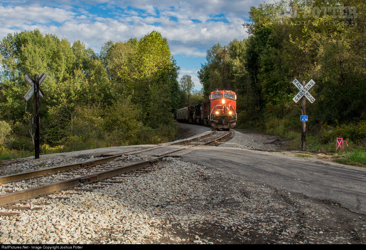 | CN 2665 finds a patch of sun in the trees as it leads 108 sand empties north on SWP's Southwest Secondary. The train is bound for Radebaugh, Pa., which is just outside of Greensburg. There, the train will be picked up by Norfolk Southern and will be taken west to be reloaded. |
