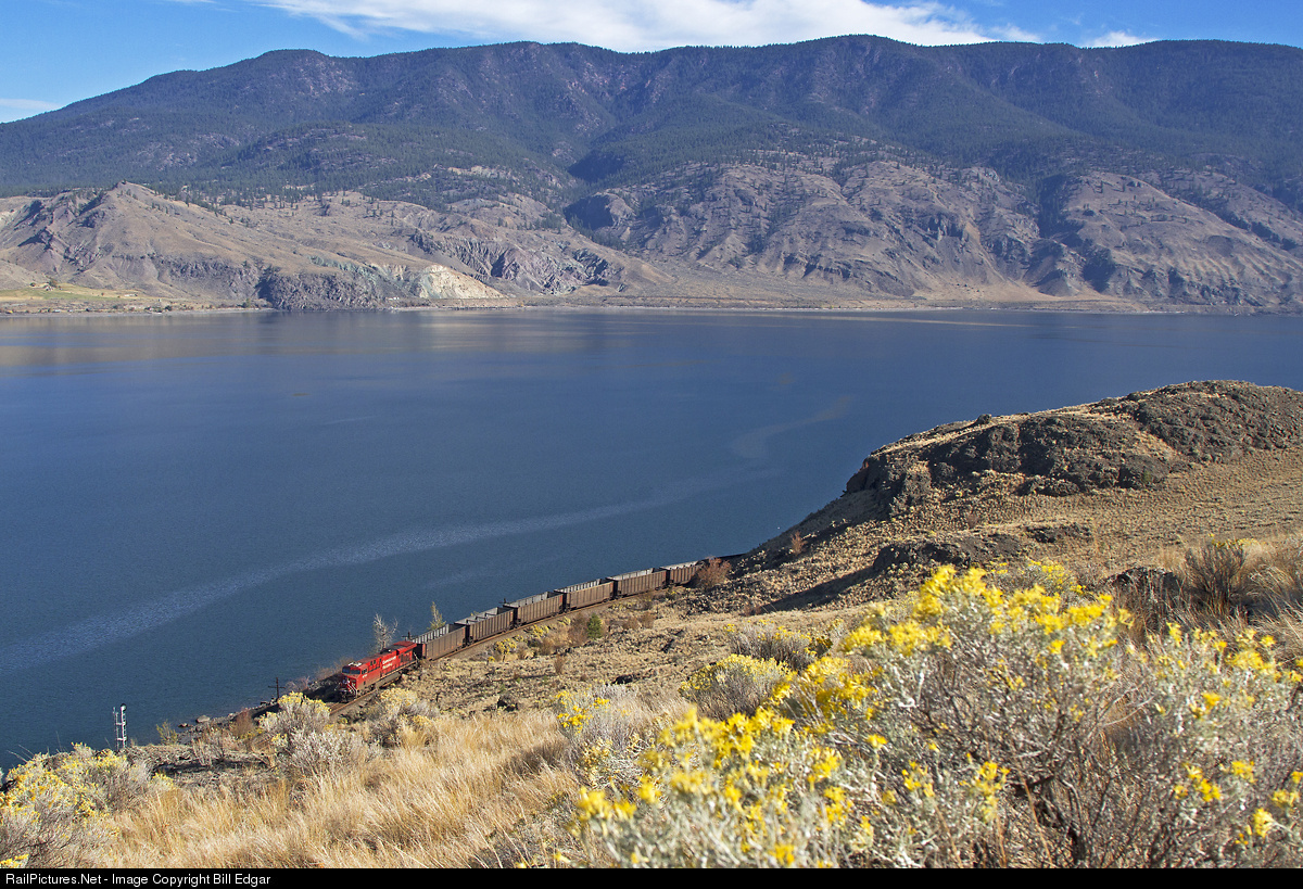 | CP 8755 gives a shove on the rear of an eastbound empty coal train that just met a westbound grain train on CP's mainline at Savona, BC. The train will continue east to Kamloops along its namesake lake. CN's main can be viewed across the lake on the north shore line. |