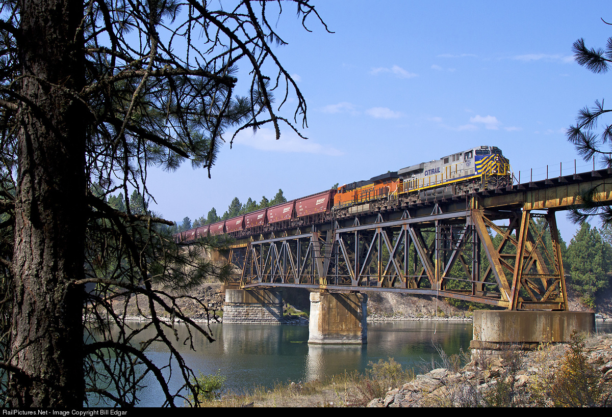 CREX 1307 leads a BNSF empty grain train east on Montana Rail Link as it crosses the Clark Fork west of Thompson Falls, MT on a classic Northern Pacific Railway bridge.