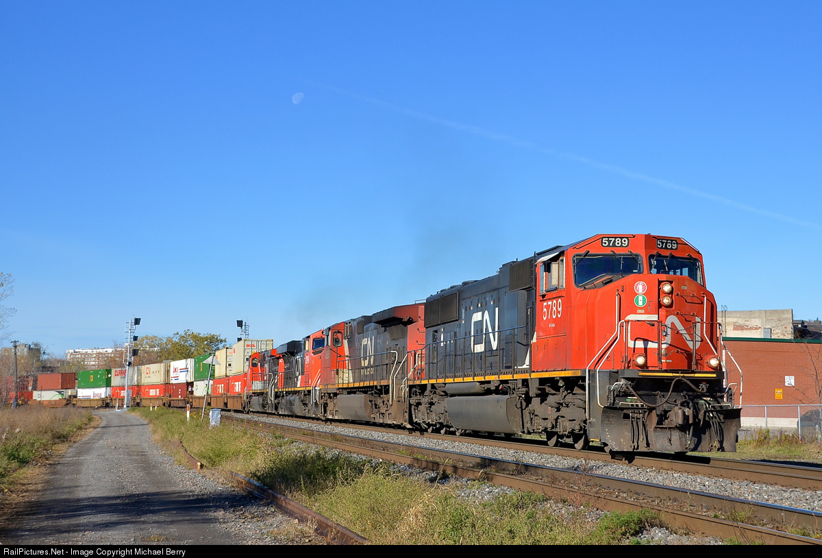 | Not an AC unit in sight. CN 120 has often had solid AC lashups composed of ES44AC's and/or ET44AC's recently, but not this morning. On a sunny morning (with the moon visible) CN 120 rounds a curve in the St-Henri neighbourhood of Montreal with four DC units (CN 5789, CN 2686, CN 2246 & CN 2600). |
