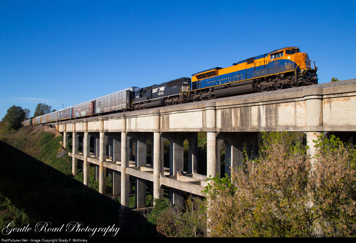 | A beautiful morning in the upstate of South Carolina greets re-routed train 28T across the Thicketty Creek bridge just south of Gaffney, SC. Heavy rains in early October caused major damage on the W-Line (Spartanburg to Columbia) which resulted in multiple trains being routed up to Charlotte and then south to Columbia. |