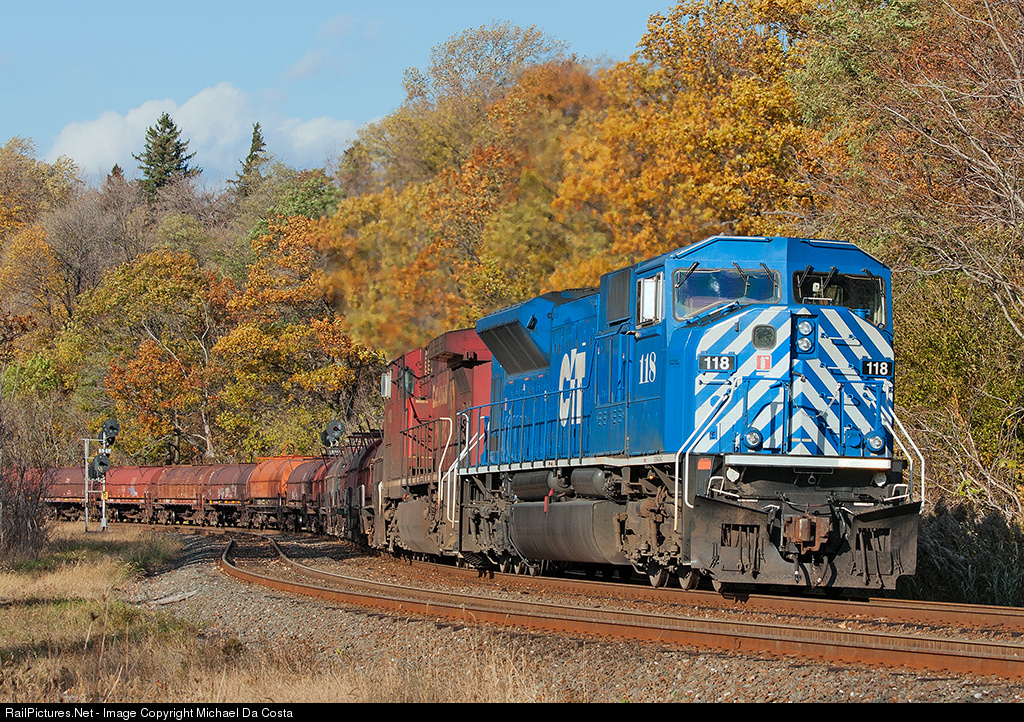 | A little something out of the ordinary, CEFX 118 adds some colour as it leads a grungy AC4400 through the CTC double track with 12,000 tons of train. |