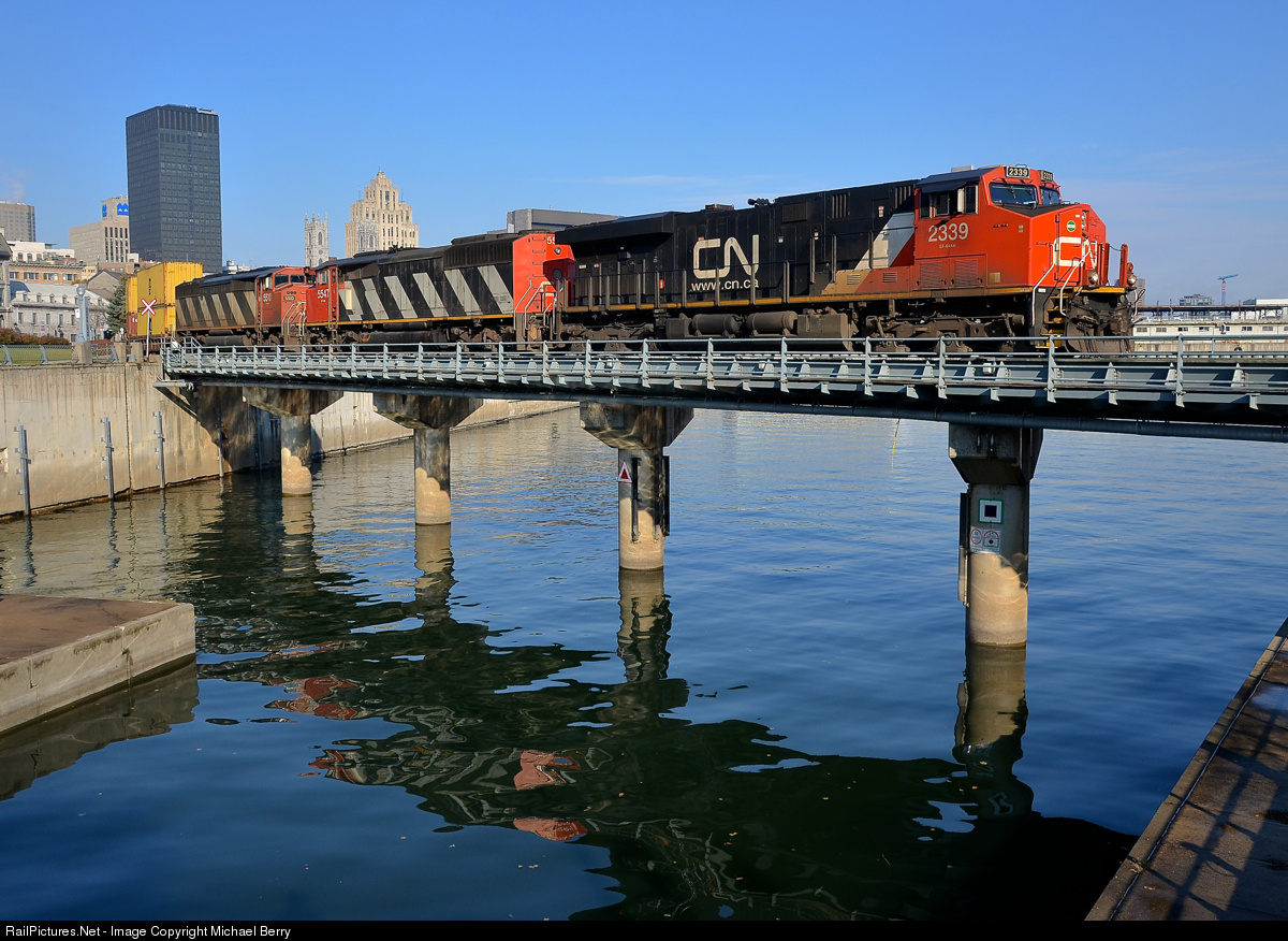 | Not quite what I was hoping for. CN 148 was reported as having an ES44DC bracketed by a pair of SD60F's yesterday, which meant that an SD60F would most likely lead CN 149 out of the Port of Montreal the next morning. Unfortunately fume issues with the leader meant that the crew rearranged the lashup to have ES44DC CN 2339 leading. Here CN 149 crosses the Lachine Canal not too long after leaving the Port of Montreal, with a long intermodal train bound for Chicago. Power is CN 2339 with SD60F's CN 5547 & CN 5510 relegated to trailing status. |