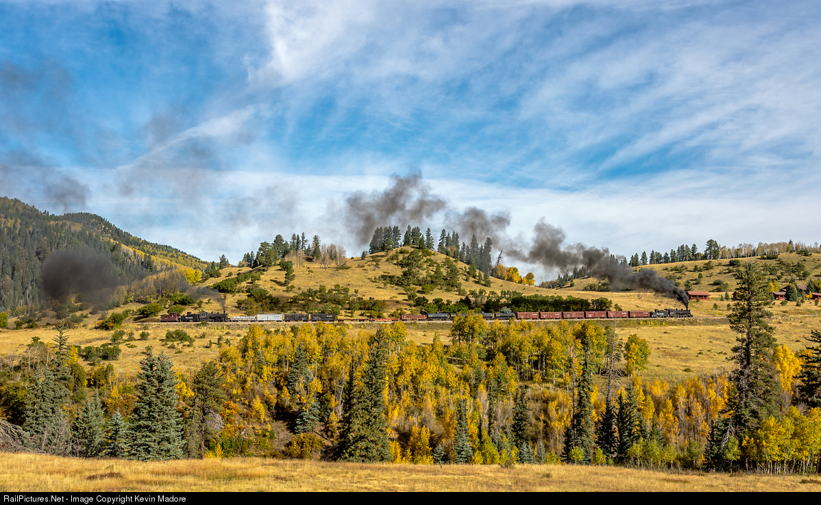 Steamscape: Lobo Lodge. Two K-36 Locomotives, 17 freight cars and one caboose make up this morning's Cumbres Turn, which is seen here hammering up the legendary 4% grade from Chama to Cumbres Pass. The train is about to pass Lobo Lodge, which is a resort featuring small cabins, and is frequented by tourists and hunters.