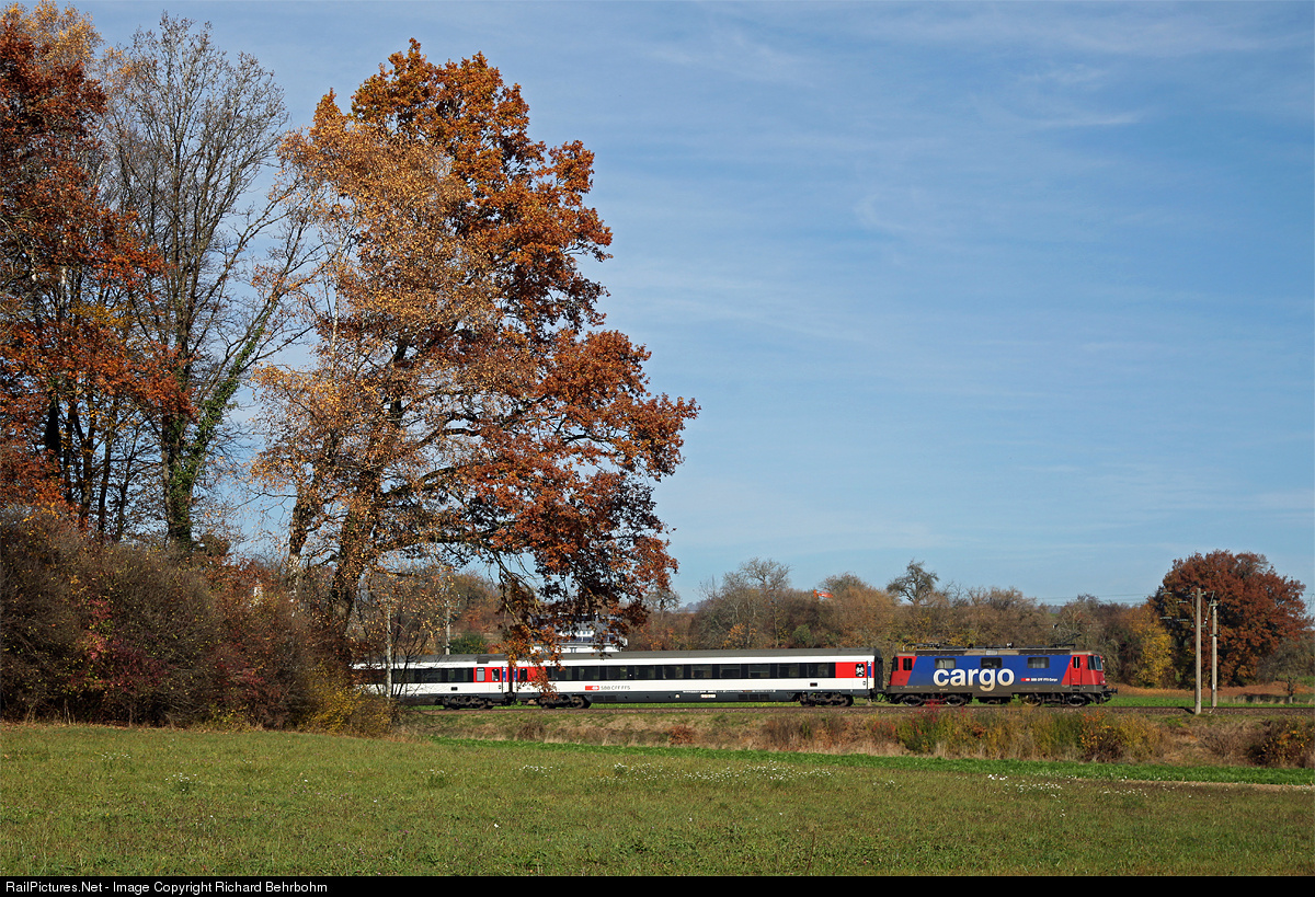 | A freight railway engine, rented by SBB passenger service, is pulling Intercity 280 Zürich - Stuttgart. |