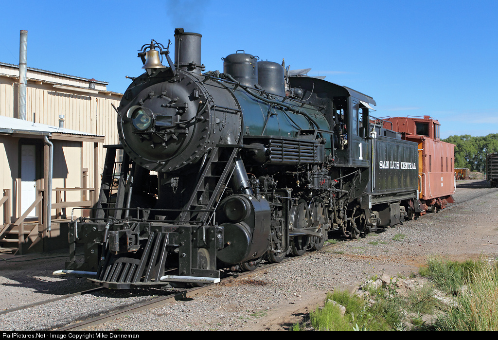 San Luis Central owned only one steam locomotive early in its history, a Baldwin 2-8-0 numbered 1, that was bought new in 1913 and retired in 1955. To celebrate the 100 year anniversary of the railroad, they operated a special passenger train on the 13-mile line from Monte Vista to Center in Colorado’s San Luis Valley. To help with celebrations, neighboring railroad San Luis and Rio Grande relettered and renumbered their 2-8-0 No. 18, to SLC No. 1. On the morning of September 1, 2013, No. 1 simmers in front of the SLC yard office at Monte Vista, Colorado, waiting for the day’s festivities. Behind the locomotive is former Southern Pacific caboose No. 1043.