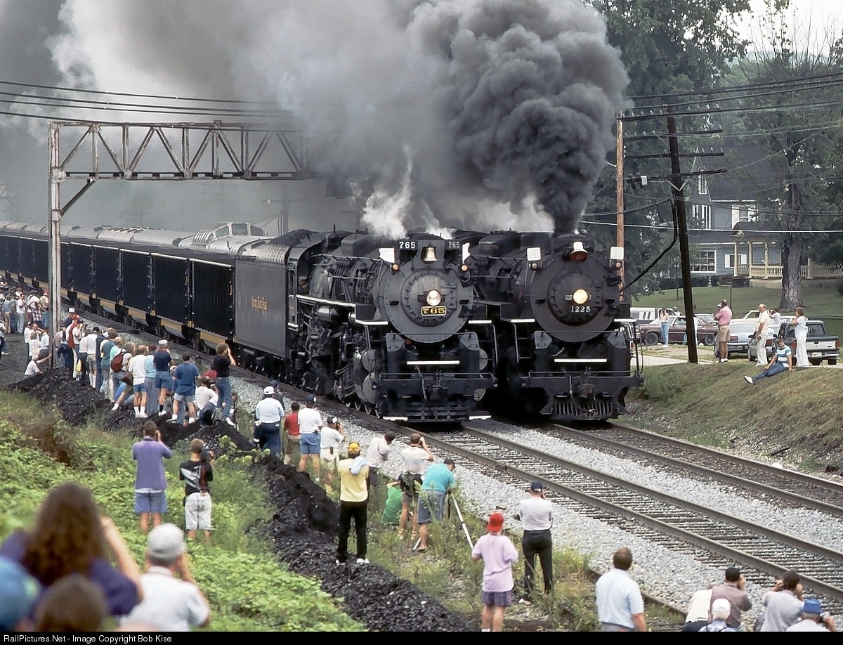 Railfans and the local population enjoy the side-by-side runby of 765 and 1225 during the 1991 NRHS Convention.