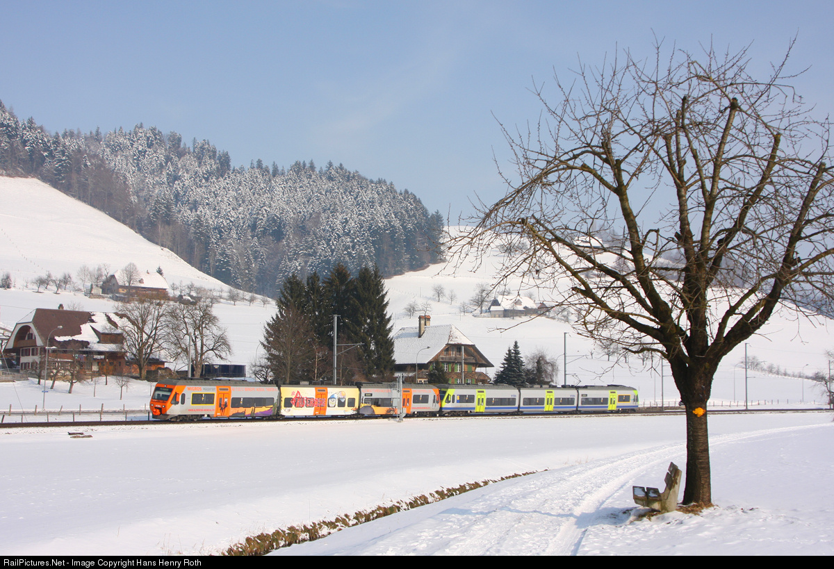 | Für einige Zeit verkehrte der Triebzug „NINA“ RABe 525 036 als Werbezug für das Musical „Alperose“. Der orange Zug sticht nicht nur in der winterlichen Landschaft stark hervor, sondern auch bei den restlichen 35 Triebzüge, welche die grüne Farbe tragen. |