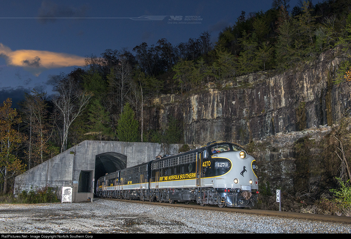 Norfolk Southern's "office car special" exits the tunnel at Nemo, Tennessee (near Wartburg) during a recent inspection trip. Nemo is located along the famous "Rathole" district of the Central Division's busy CNO&TP mainline (Cincinnati, New Orleans, & Texas Pacific). Prior to a major line relocation and upgrade project in the 1960's, the route was nicknamed the "Rathole" due to the numerous tunnels between Harriman, TN, and Danville, Kentucky. The "new" tunnels at Nemo were constructed with electrification in mind, which resulted in higher ceilings than normal tunnels. Although the electrification plan was never put into place, the innovative thinking of the Southern Railway resulted in tunnel clearances that were ready for increased freight car heights decades later. Ever since the advent of doublestack intermodal cars, the "Rathole" has been a preferred and highly suitable routing for the commodity, and is one of Norfolk Southern's busiest arteries. Photo by Casey Thomason. For more information about Norfolk Southern, visit www.nscorp.com