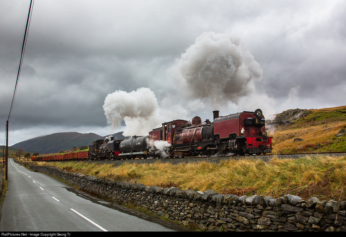 | The 2-6-2+2-6-2 narrow gauge Garratt steamlocomotives NNG 16 # 138 and 87 ex South African Railways (SAR) and now runnning for the Welsh Highland Railway are pulling a long photo charter freight from Rhyd Ddu towards Beddgelert near Pits Head. The gauge is 597 mm or 1 ft 10 3⁄4 in. # 138 (crimson livery) was built by Beyer-Peacock in 1958, # 87 (midnight blue livery) by Cockerill in 1937. The Garratts are running in "South African style" with a water tank car coupled between the two locomotives. |