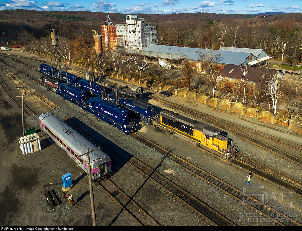 | Pan Am Railways took delivery of five ex-QNSL SD40-2s this morning - lettered MEC 3400-3404 - but owned by GATX, at the Pan Am Southern East Deerfield Yard. The units are currently slated to be working on the Pan Am Southern EDRJ/RJED pool and likely running through to Selkirk, NY. The units are seen at the service pit in East Deerfield, MA and drone photo with permission/cooperation of Pan Am Southern. |
