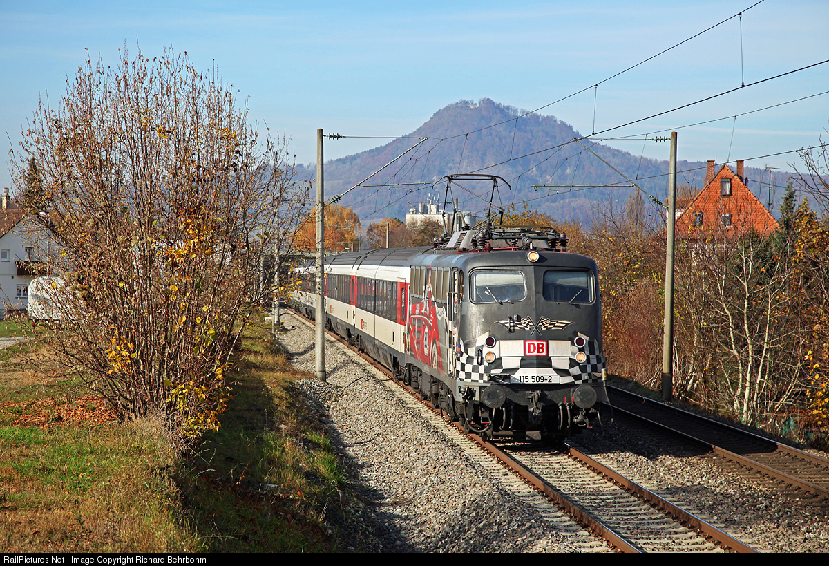 | 115 509, built in 1969 by Krauss-Maffei in Munic and since 2011 with publicity for "80 years of DB AutoZug", is always in use for Intercity trains on the line Stuttgart – Singen (Hohentwiel) (-Zürich). |