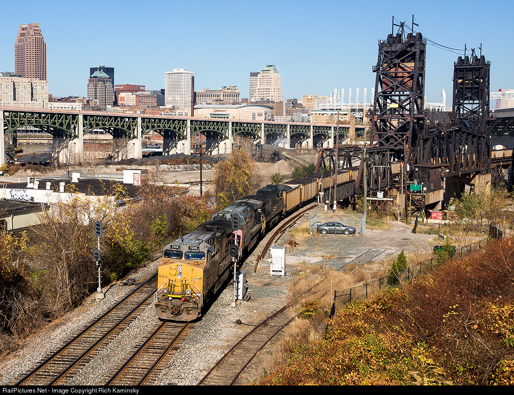 | A westbound Norfolk Southern coal train led by a pair of Union Pacific AC4400CW locomotives, including a patched ex-Southern Pacific in the second position, crosses the former NKP drawbridge over the Cuyahoga River. |