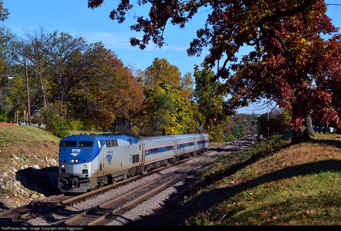 RailPictures.Net Photo: AMTK 67 Amtrak GE P42DC at Webster Groves, Missouri by John Higginson