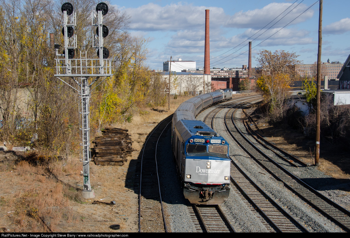 | A Downeaster train passes through Lawrence on its way to Boston. Many old mill buildings in Lawrence survive and have been repurposed. While it is a stop for MBTA commuter trains, Amtrak simply passes through town without stopping. |