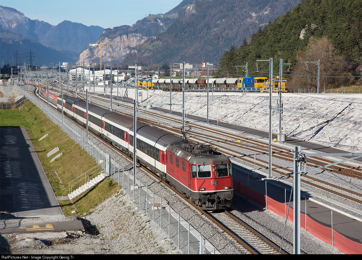 | Inter Regio 2323 from Basel to Locarno with Re 4/4 II 11158 in Rhynächt, between Altdorf and Erstfeld. Only some meters on the right is the north portal of the new Gotthard base tunnel (GBT), which will open in june 2016 for the operation and in december 2016 for timetabled traffic. All tecnology of the 57 km long tunnel is ready now and the test runs have started. |