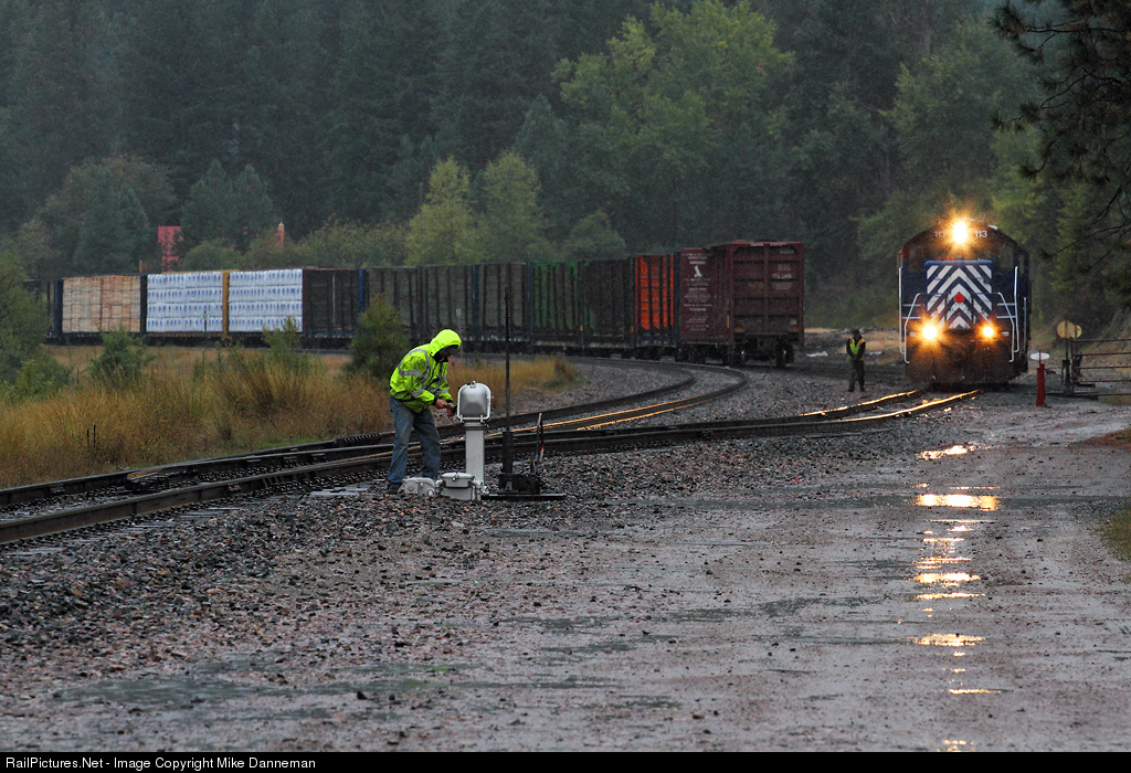 In the pouring rain, a member of Montana Rail Link’s Paradise local works with a power switch so the pair of GP9s can complete running around its train at St. Regis, Montana, on September 25, 2013. Unfortunately, this local has recently been discontinued, with the last two customers in the area now served by the Gas local.