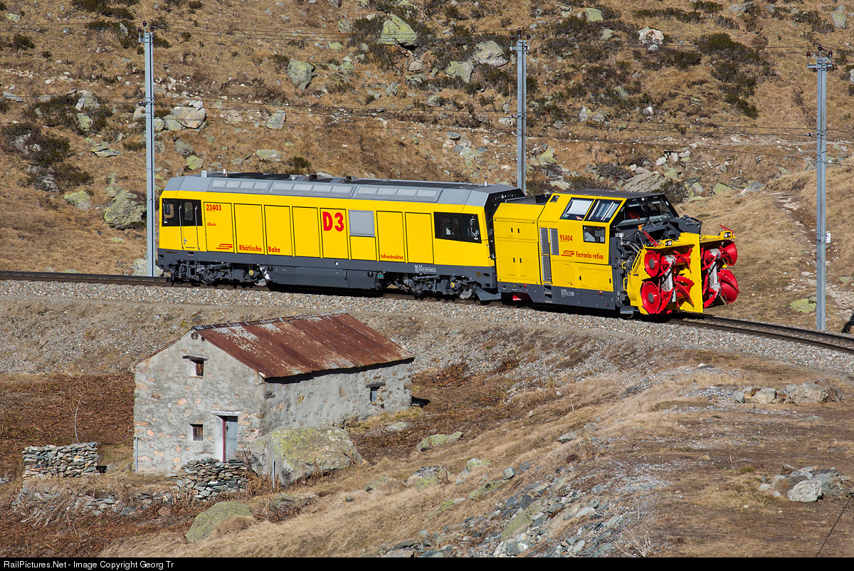 | Software test of the future (from this winter) snow fighting equipment on the Bernina line of the Rhaetian Railway. Snowblower Xrot mt # 95404 with shoving diesel locomotive Gmf 23403 (D3) (Schalker Eisenhütte/Gelsenkirchen/Germany 2013, 1800 kW) near Ospizio Bernina. |