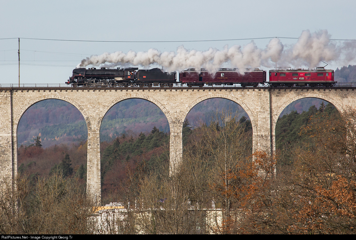 | Transfer run of the Baldwin built former French Railways "Mikado" 141 R 568 with her tools and staff car (a former french postal car) and Re 4/4 I 10009. The privately owned steamlocomotive, pictured on the Rhine viaduct near Eglisau, run from the previous base in a shed in Schaffhouse to her new temporary home in Vallorbe (Swiss-France border station). |
