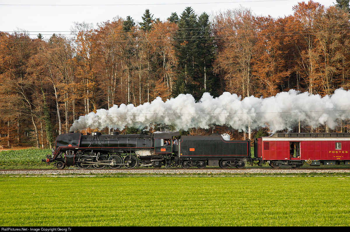 | Transfer run of the Baldwin built former French Railways "Mikado" 141 R 568 with her tools and staff car (a former french postal car) and Re 4/4 I 10009. The privately owned steamlocomotive, running track speed between Lyssach and Hindelbank, run from the previous base in a shed in Schaffhouse to her new temporary home in Vallorbe (Swiss-France border station). |