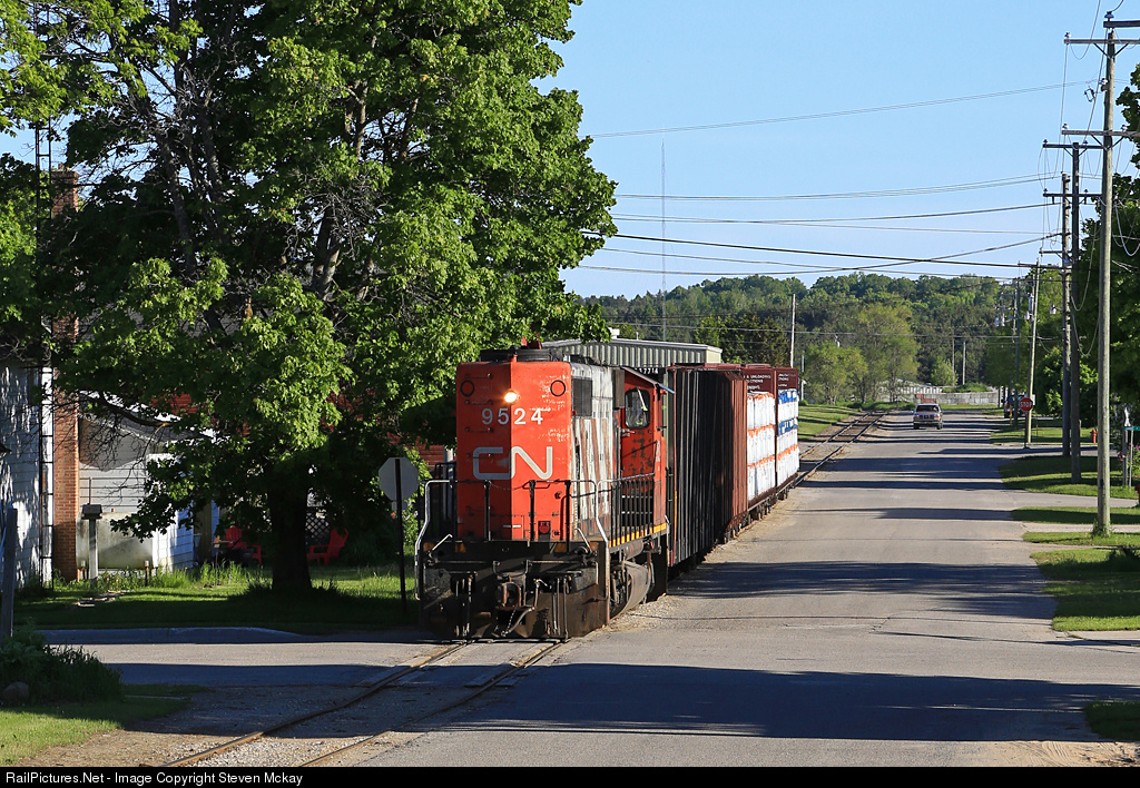 | I don't know if you wanna call this street running or just really cool running, but CN 9524 comes back up the small spur in Newberry after working a couple industries at the end of the line. Once they reach the "mainline" they will head for trout lake to drop off and pick up cars from the road train. This is one of the least shot spurs and branch lines on the CN in northern Michigan as its hard to know when they go and a lot is done at night. |