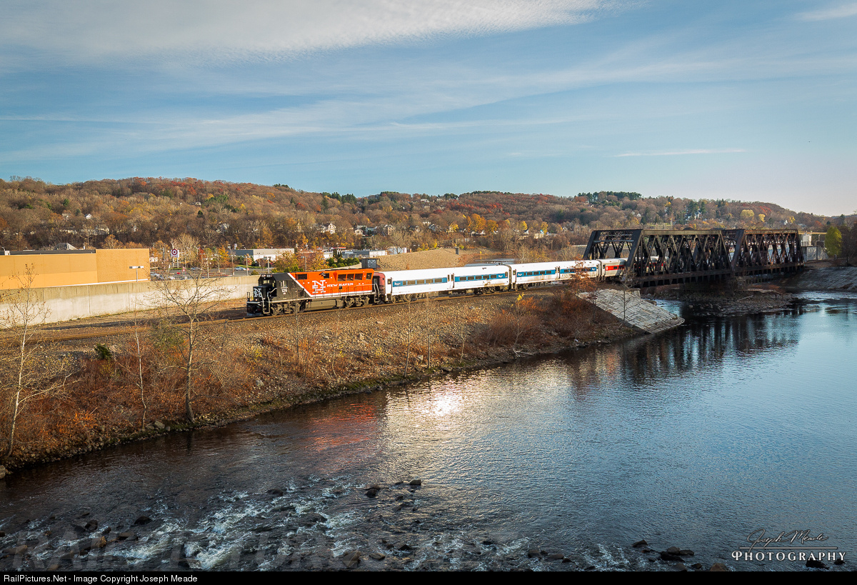 MN 6930 glides across the trestle over the Naugatuck River coming in for a station stop in Ansonia, Conn.