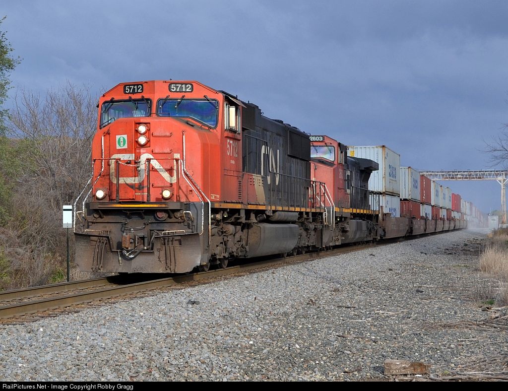 As the sun pops out for a moment, CN SD75I 5712 leads a southbound stack train through North Duplainville.