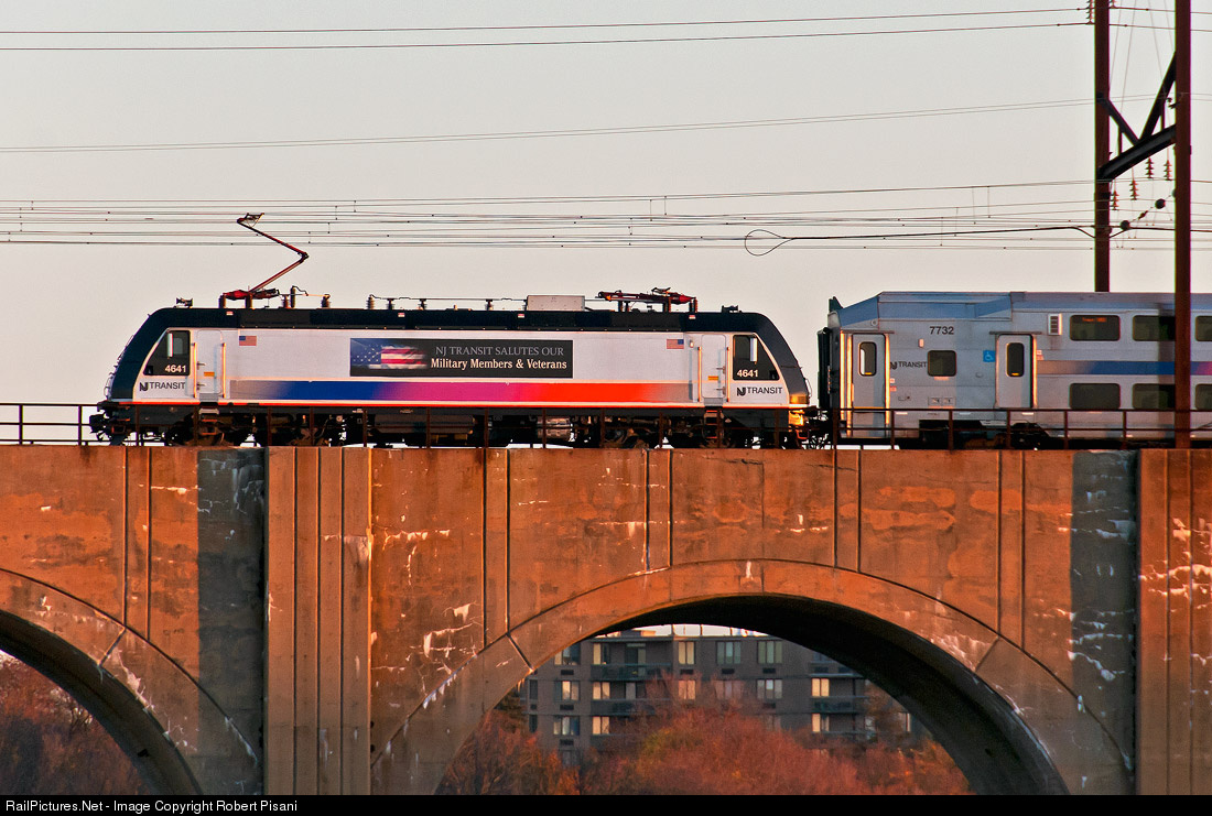 The setting sun highlights NJ Transit's "Veterans" ALP-46A as it shoves a Trenton-bound local across the Raritan River into New Brunswick. This is actually one of several NJT ALPs to be so decorated.