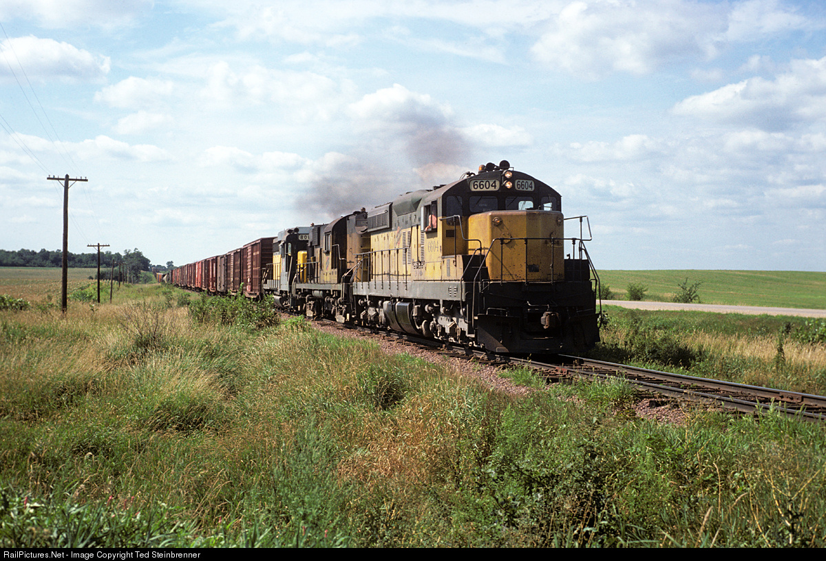 | C&NW low-nose SD9 #6604, built with a high-nose as #1704, leads RS11 #4251 and a GP30 as it approaches Waseca, MN. |
