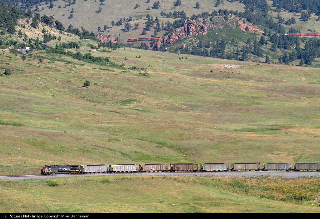 As the rear of an eastbound Union Pacific coal train heads through Rocky, Colorado, below—an eastbound BNSF manifest freight passes through Tunnel 1 in the background on August 11, 2015. The rear DPU on the coal load is Southern Pacific AC4400CW No. 335, and has recently past milepost 19, while the BNSF eastbound is four track-miles west approaching milepost 23 in Coal Creek Canyon.
