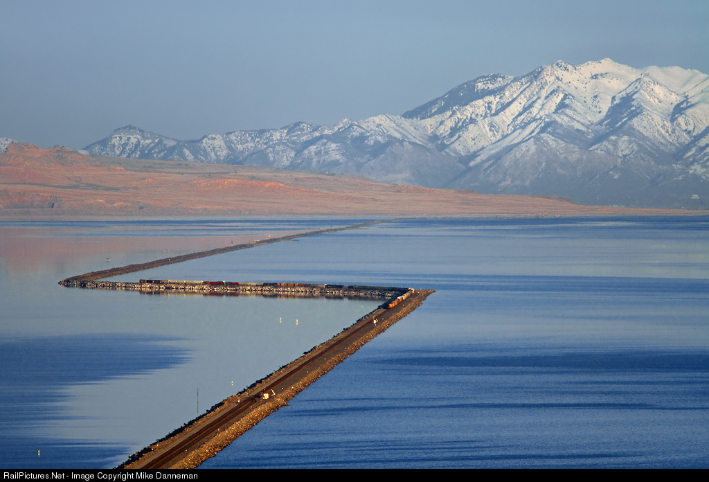 An eastbound Union Pacific freight is on the long trek across Great Salt Lake at Lakeside, Utah, on March 5, 2012. A 12-mile wood trestle used to carry the railroad straight across the lake, but during 1952-59, Southern Pacific replaced it with the fill that the train is negotiating zig-zagging to the north. Promontory Peninsula and the Wasatch Mountains dominate the background, with Ogden located between them. Over the years, reduced circulation of the north arm of the lake due to the fill caused it to become much saltier than the southern portion. The south arm is fed fresh water by three major rivers causing the imbalance. To mitigate this problem, UP recently announced that they were going to cut in a new 180-foot bridge on the earthen causeway to be completed by the end of 2016.