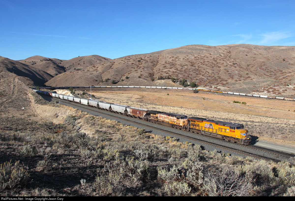| Union Pacific's Durkee Loop sits on the 2.2% climb up Encina (Hindman) Hill. The loop is also known as the Pritchard Creek Horseshoe and Leonard Curve. Leonard Curve is likely the original name when this area was known as Hindman Hill. This heavy 110 car grain train rates 8 big AC motors for the grades of Oregon. The DPU swing power can be seen pushing/pulling hard in the background. The rear DPU is out of sight to right. The UP8249 is a 'New' heavy AC45 specifically designed to pull heavy trains like this up mountain grades. The UP7024 is a veteran mountain climber that likely saw service out of Minturn on Tennessee Pass in 1997.