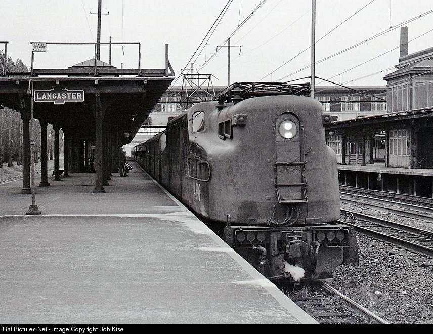 The National Limited, on its way from New York to Harrisburg and Kansas City, pauses at the 1929-built PRR high-level platform. The center two tracks here were for through trains and freights, and have since been removed. Locomotive 4895 was built in April, 1940 by PRR/Westinghouse, and was 36 years old at the time of this photo, which was scanned from an ASA-400 Kodak TRI-X Pan negative.