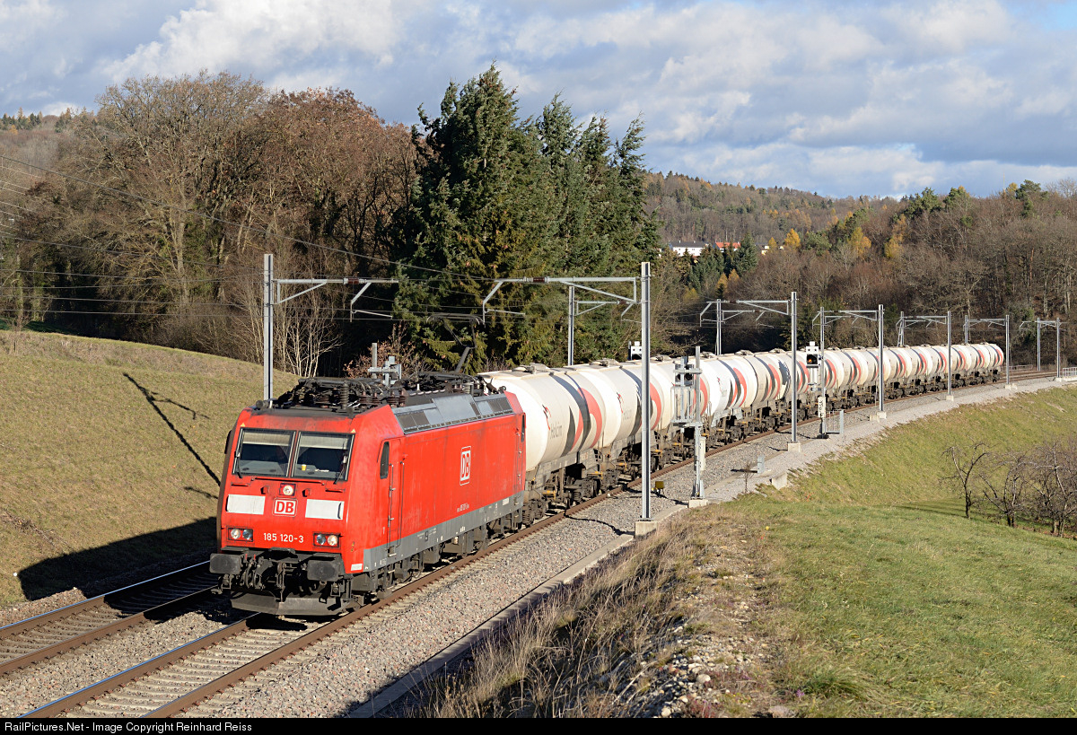 | DBSR 185 120, hired to SBB Cargo, heads a rake of cement waggons from Singen to Zizers |