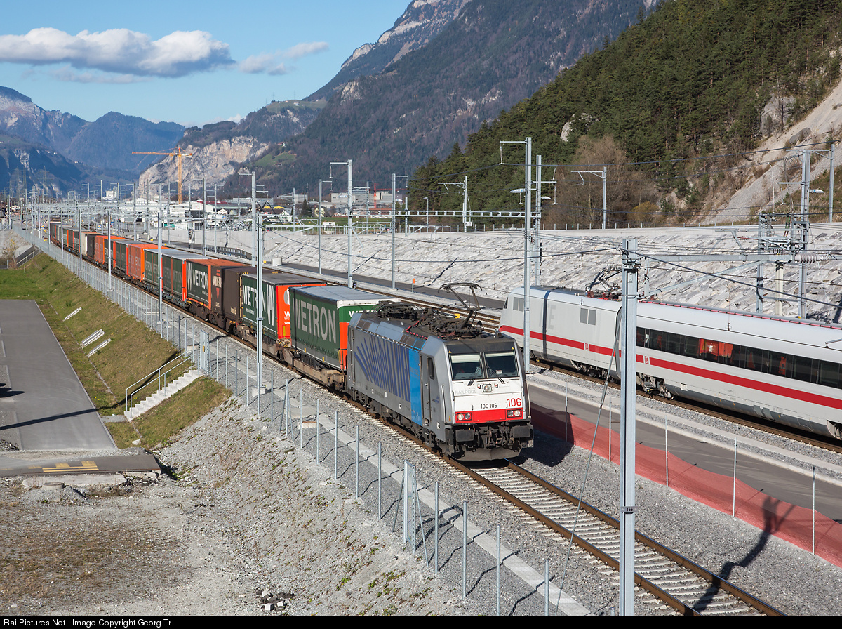 186 # 106 of Railpool in the "Zebra" paint scheme of the "Lokomotion", rented by the BLS since december 2013, with a southbound freight train over the Gotthard mountain line, is meeting the german ICE-S high speed test train, near the north portal of the new Gotthard Base Tunnel (GBT).