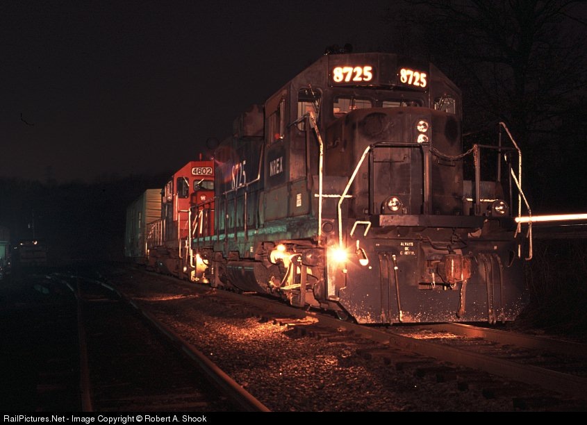 A night shot of the NREX #8725 and WE #4602 both on lease to the SWP railroad in Western PA.