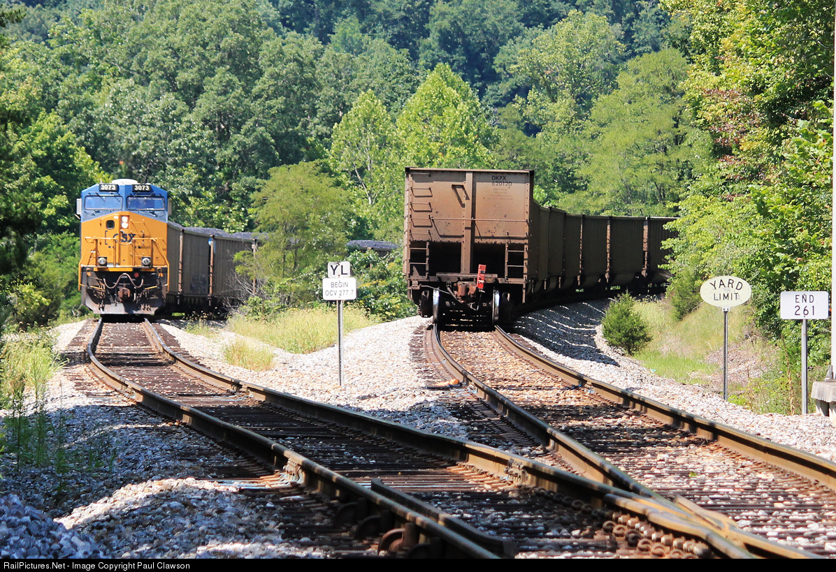 | CSX 3073 is about to get a clear signal from the east end dispatcher at Knoxville with the passing of NS 745 at the CSX NS connection track in Big Stone Gap, VA. This photo depicts the start of both the CSX Cadet Yard and the Norfolk Southern Big Stone Yard. |