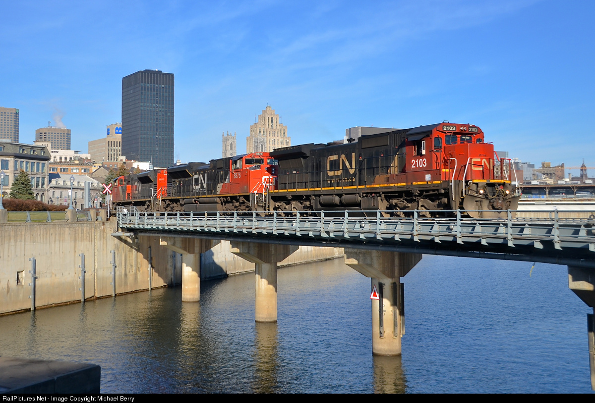 | A standard cab leader for once. Standard cab C40-8 CN 2103 is leading CN 149, a nice change from the widecab ES44AC's which are now power for this train most of the time. Here CN 149 crosses the Lachine canal with high priority intermodal from the harbour. Trailing is CN 8876 & CN 8855. |