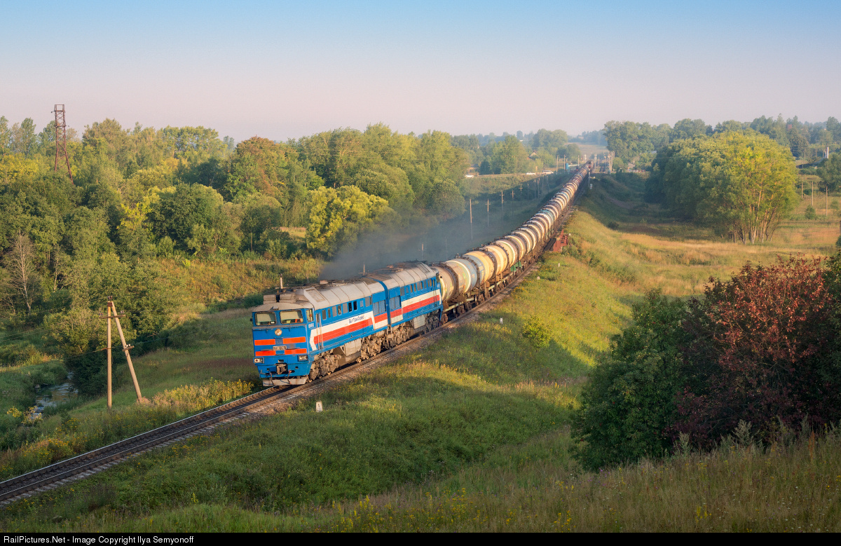 | 2TE116-1719 diesel locomotive with freight oil train goes along the valley of river "Sheshma" near Zubtsov town at the sunrise... This train belongs to a private company "BaltTransService" affiliated by "Transnefteproduct". "BaltTransService" is one of the largest private operators of oil cargo in Russia, the CIS and Baltic countries. |